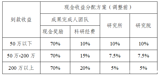 为适应科技成果转化新形势,积极鼓励所科研团队通过授权许可、技术转让等方式开展成果转化工作,经所务会研究决定,特对《中国科学院合肥物质科学研究院科技成果转化管理办法》(科合院发科促字【2023】3号)中收益分配条款进行优化调整,将文件中规定的技术许可和转让现金收益分配中所里留存部分返还给成果完成人团队作为科研经费使用,具体分配比例如下: